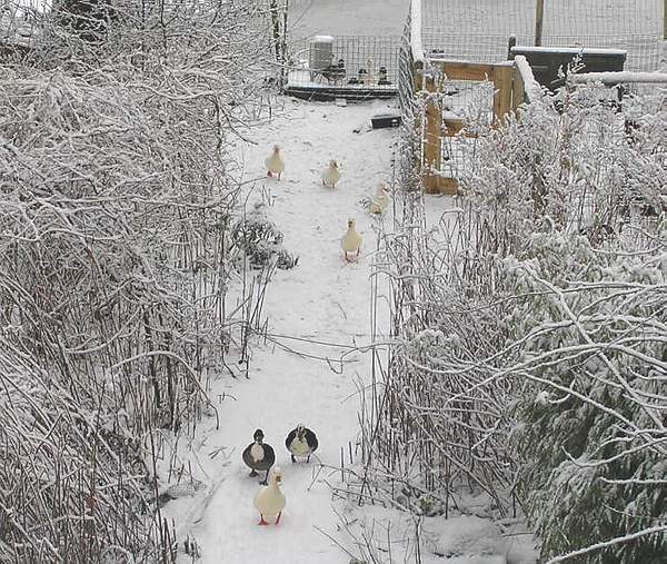 Wat de eenden niet weten zodat ze in rotten van zeer velen meermalen per uur het erf op komen.