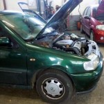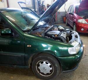 De auto is naar de garage gebracht en daar is hij nu nog.