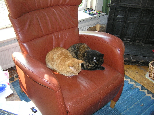 Die stoel is J.’s zetel, als ze niet achter haar bureau zit, en daar mogen katten ook op schoot plaatsnemen. Ik zit er nooit, als ik er ben woont Eeb daar om in toenemende mate langdurig bezoek te krijgen van Sam. En Guus ligt bij voorkeur op mijn koffer en mag daar niet door de fotograag gestoord worden. En het drietal weet niet wat ik wel weet: volgende week woensdag doen ze of zich dit nooit heeft voorgedaan.Â