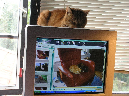 De lezer weet dat Sam graag op de monitor mag liggen, dat heeft J. al vaak bericht.