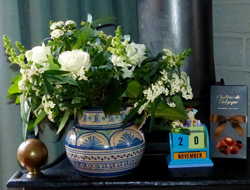 Ik was jarig (gisteren) en twee aardige mensen mailden me een verjaardagsgroet, 1 stuurde me een kaartje (dat vandaag aankwam – tja, PostNL, hè) en iemand liet een prachtboeket bezorgen mét bonbons.