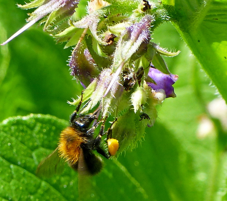 De Boomhommel (Bombus hypnorum) is gemakkelijk in het veld te herkennen aan het roodbruine borststuk en de witte achterlijfspunt. De kop is iets korter dan die van de Akkerhommel. Sommige werksters hebben een donkerder gekleurd borststuk maar altijd een wit kontje.