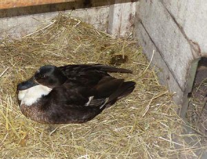 Toen ik weg ging zat in het konijnenhok aan de slootkant een witte eend te broeden.