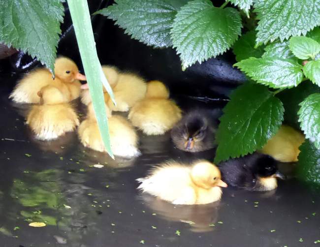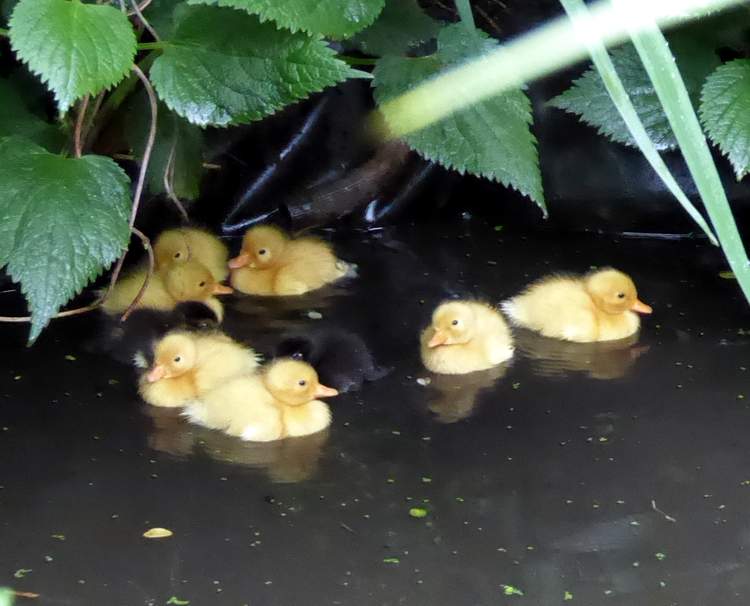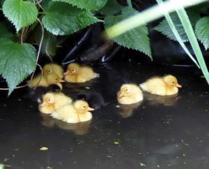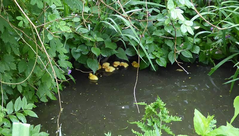 R. mailt me: ze zijn uitgekomen (uit de eieren), het zijn er negen en eerst zag hij ze in de vijver – slimme moeder!
