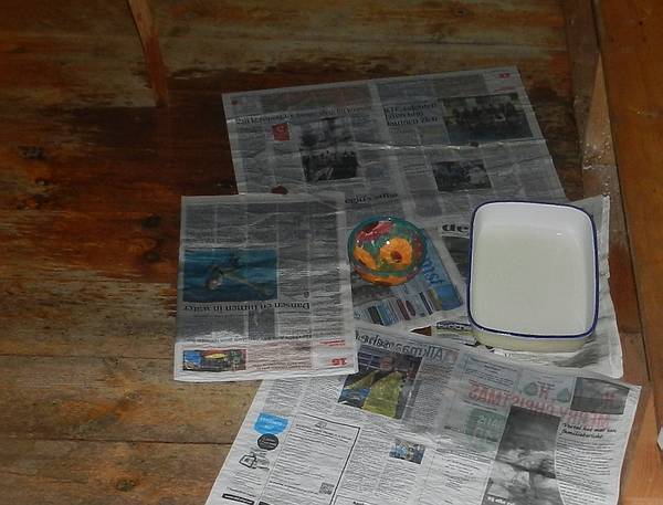 Dus legde ik kranten neer en plaatste een schaal om de ergste druppels op te vangen.