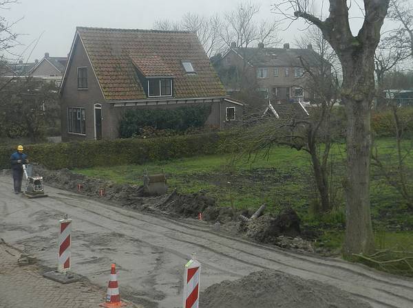 Nu is het anderhalve dag (ruim) en ik heb zand zien storten en nog meer zand en zware machines rijden af en aan en nu is 1(!) man met een mini-machientje de aarde aan het pletten.