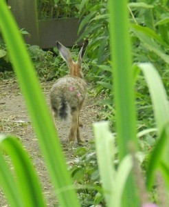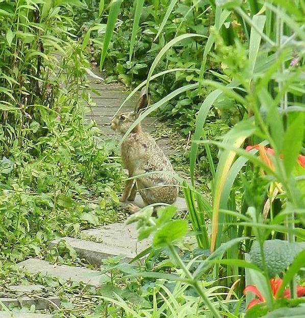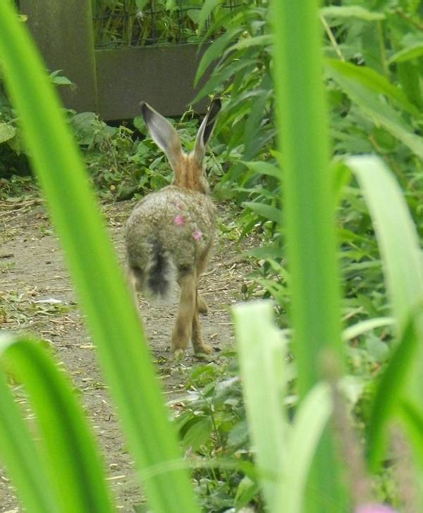 Maar het is een grote haas die bij hun ren zit en naar de achtertuin vlucht zodra hij me uit de schuur ziet komen.
