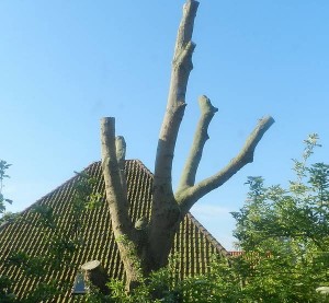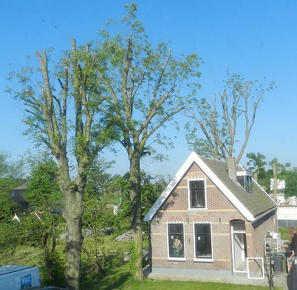 Tot mijn genoegen zie ik dat de in het voorjaar gekortwiekte bomen aan de overkant mooi uitschieten met fris groen. Dit itt de buurboom waarover ik vaak heb geklaagd dat hij mijn zon wegnam maar dit vind ik wel een heel zielig gezicht.