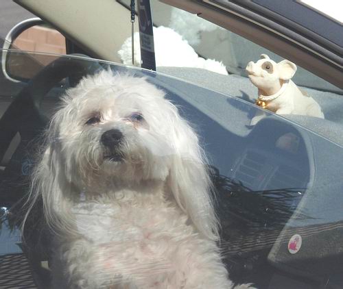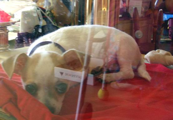 Is die écht, vroeg ik? Hij was echt. Het was een chihuahua en het was een pup en hij heette Samson. Ze hadden ‘m pas en de andere honden moesten nog aan ‘m wennen, daarom ging hij mee naar de winkel. En dat plekje in de vitrine vond-ie leuk.