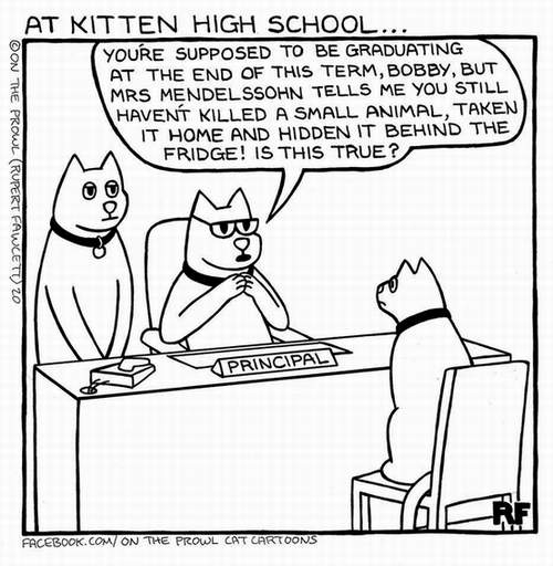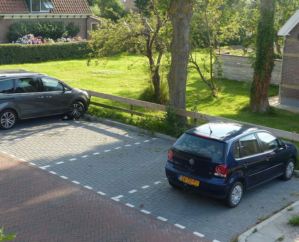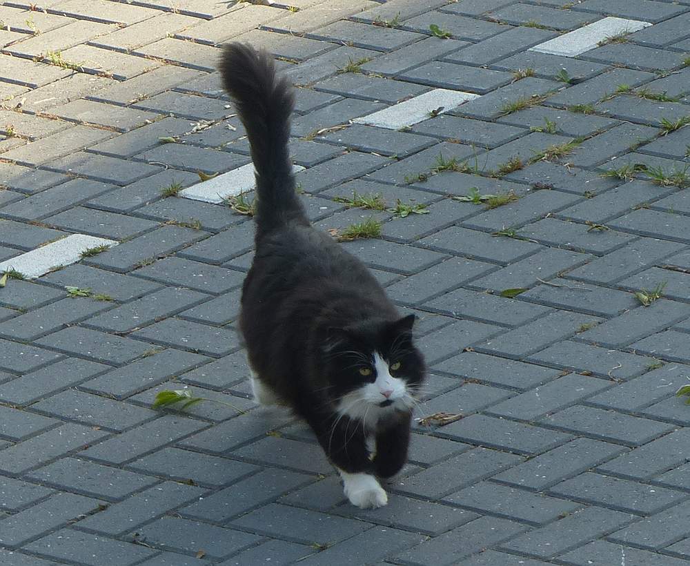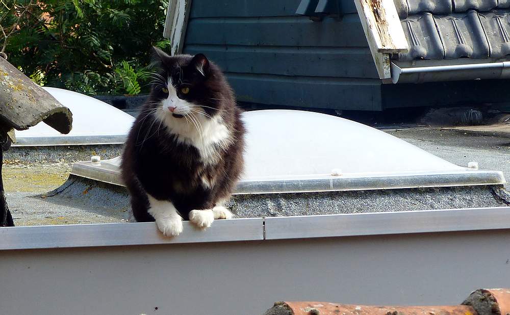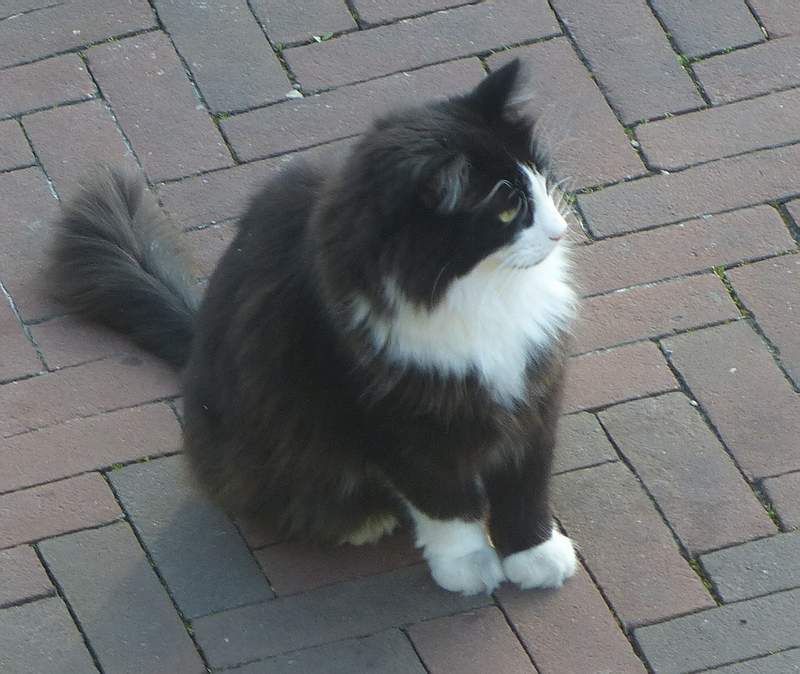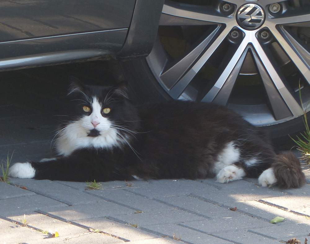 Dan gaat hij op het stoepje om zich heen zitten kijken tot hij er genoeg van heeft (na een paar minuten) of tot er een auto aankomt.