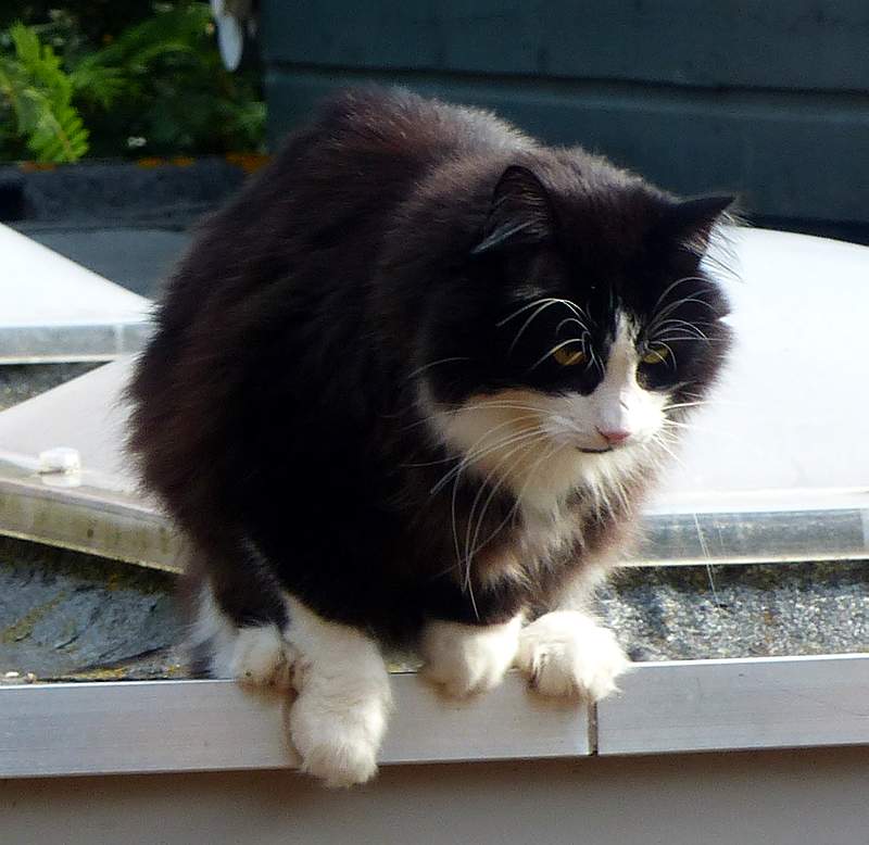 Dan gaat hij op het stoepje om zich heen zitten kijken tot hij er genoeg van heeft (na een paar minuten) of tot er een auto aankomt.