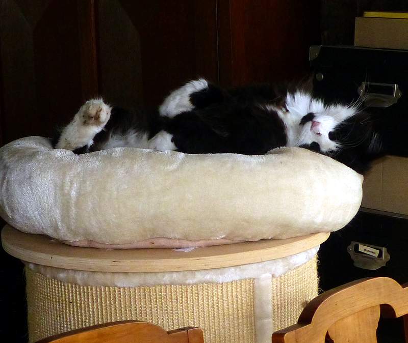Om 1 uur lig ik nog wakker en sluip de trap af hopend Loki aan te treffen op zijn toren of breed liggend op tafel.