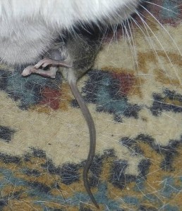 Maar Sammie is me te snel af, sleept de muis naar binnen en legt die op het tapijt.