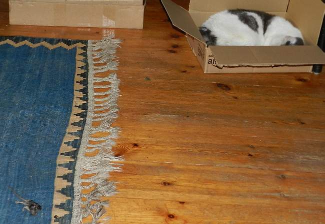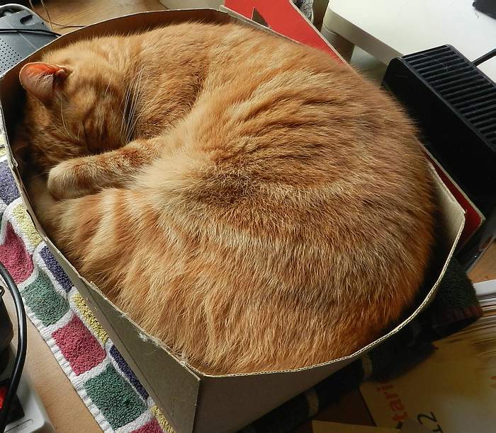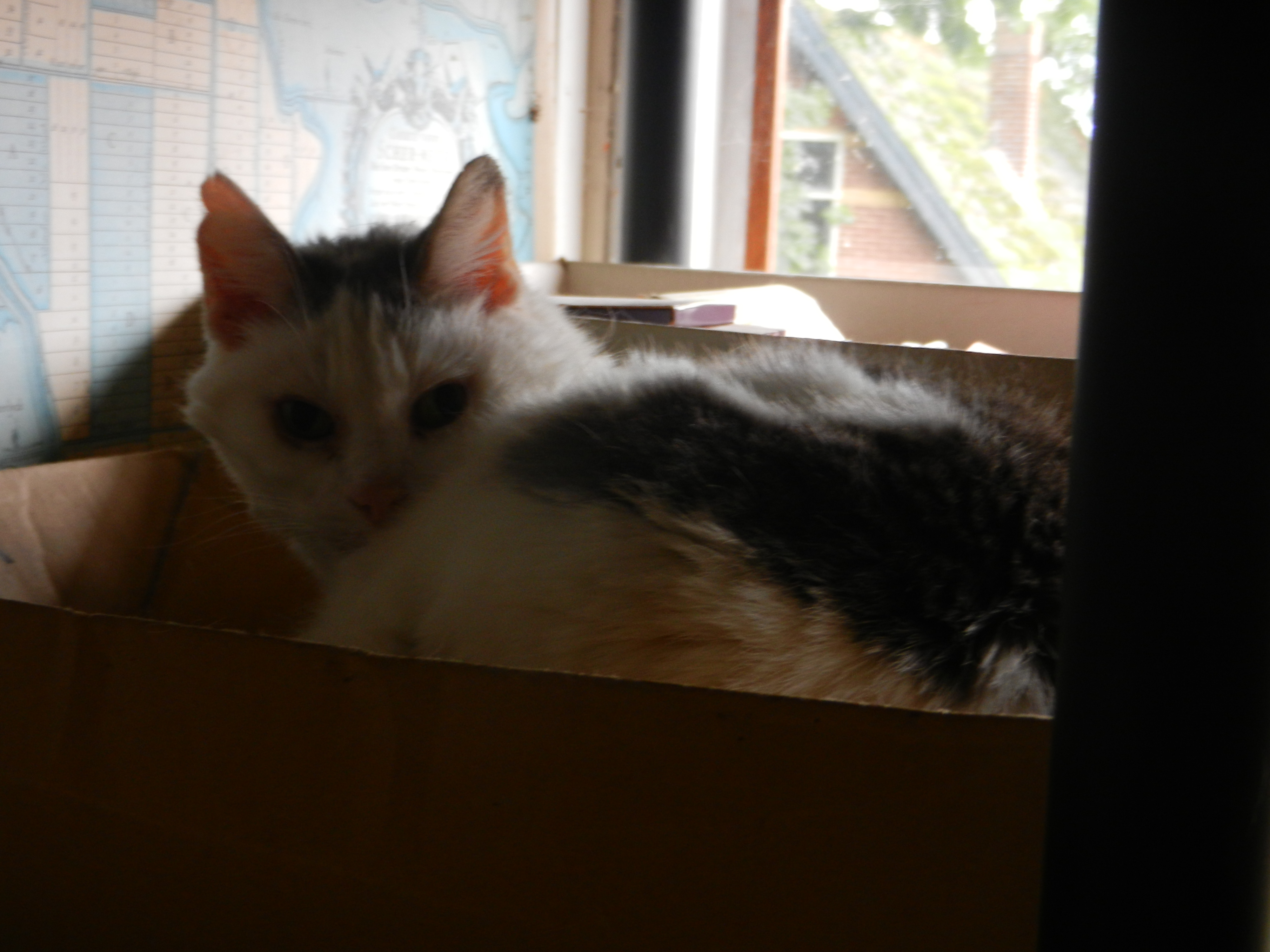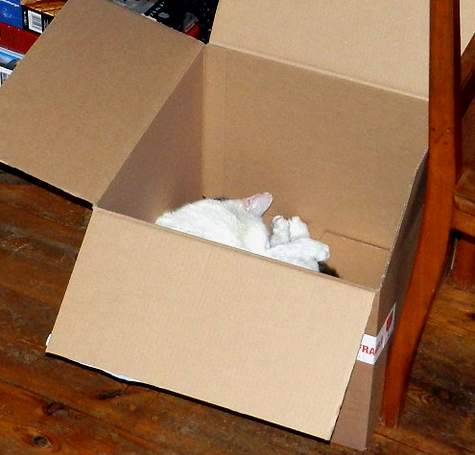 Waarna mijn trotse kater zich te ruste legt in zijn meest recente slaapplaatsdoos.