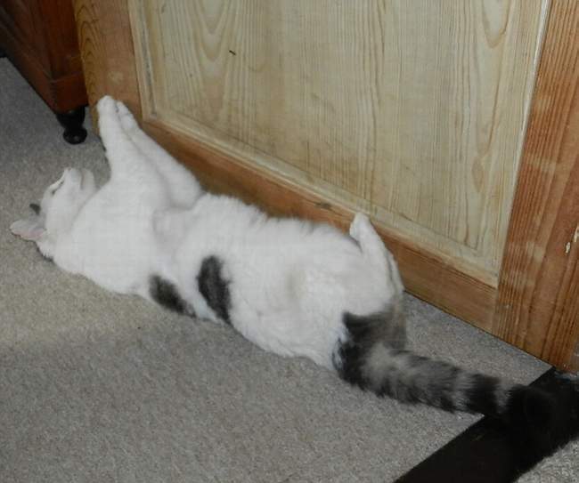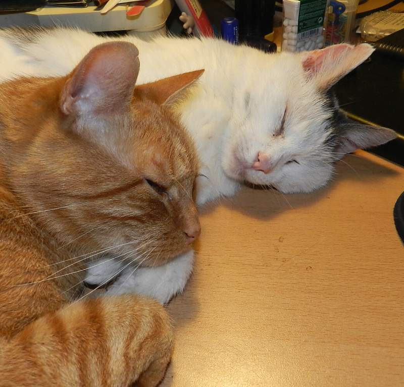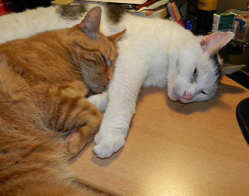 Maar toen ik om half elf nog even inlogde, vleide Guus zich voor me op het bureau en kroop Sammie half op schoot en half op het bureau in Guus.