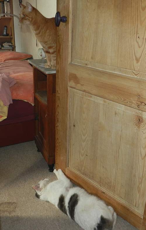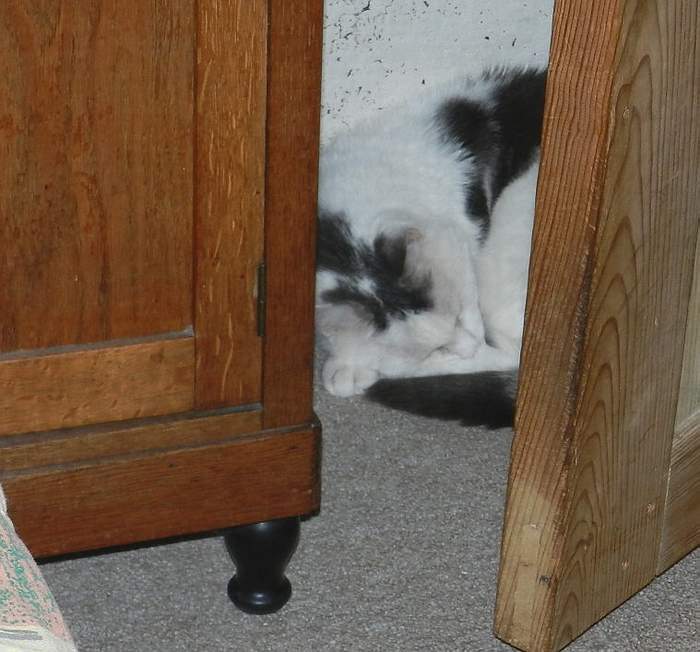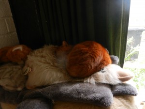 Maar – ik commentte dat al – die katten doen heel anders als J op pad is. Hier nu de favoriete plekken zoals ze na een paar dagen waren uitgekozen. Er zijn er meer, maar dit zijn de superfavorieten. Ssstt, niet storen, dus niet flitsen, dan is het beeld maar vaag.