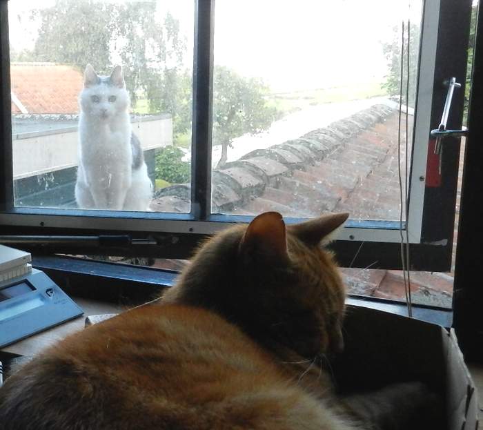 Ik ga toch naar buiten, eigenlijk vooral om te voorkomen dat Sammie -zoals hij graag doet- de muis binnenbrengt waar die dan nog blijkt te leven en enthousiast een kolonie sticht.