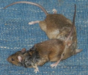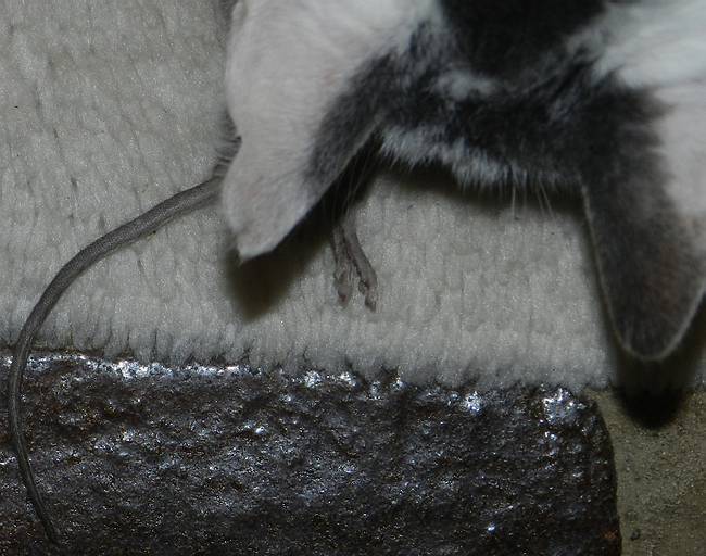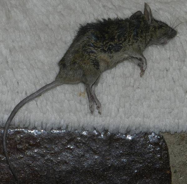 Deze kwam duidelijk uit de schuur want aan zijn snorharen kleefden wat korrels van het isolatiemateriaal waar de muizen doorheen hebben geknaagd.