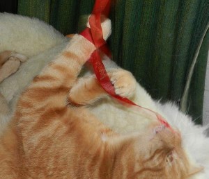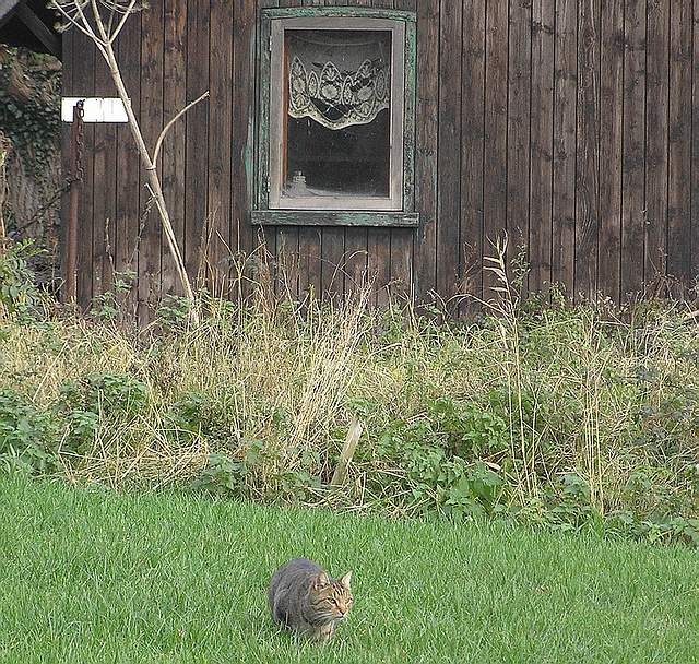 Ik hoor Guus binnenkomen. Met de loei die ik houd voor ‘grote prooi’ die dan duidt op de vangst van een klein muisje dat in 1 hap óp is (of per ongeluk is ontsnapt achter een plint).