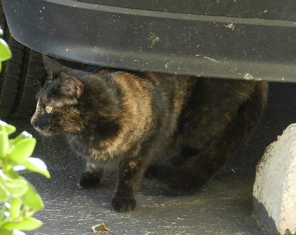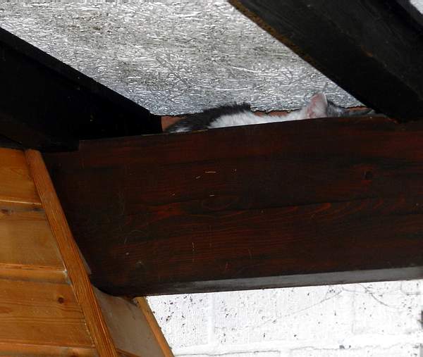 Om vijf uur nadat ik overal elders had gezocht scheen ik met de zaklantaarn onder het bed op de plaatsjes waar hij normaal zich *niet* verstopt. Daar zat-ie.
