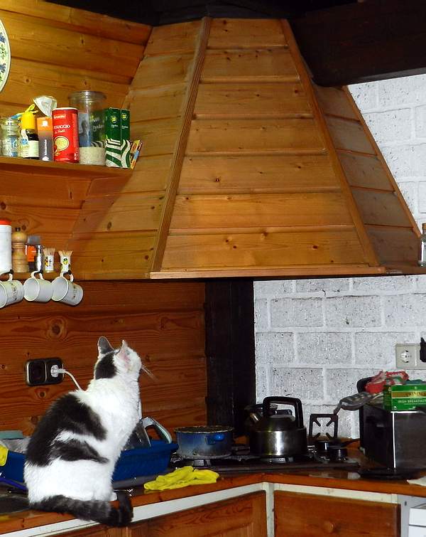 Hij overwoog een sprong via de afzuigkap naar de balk boven de keuken.