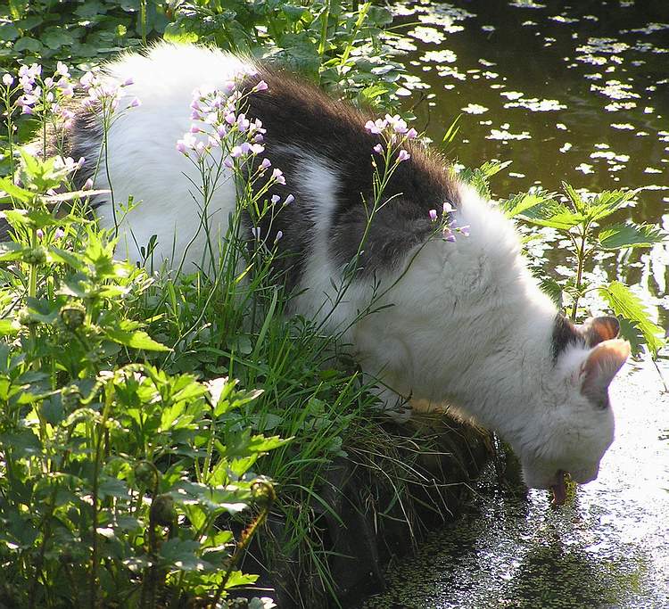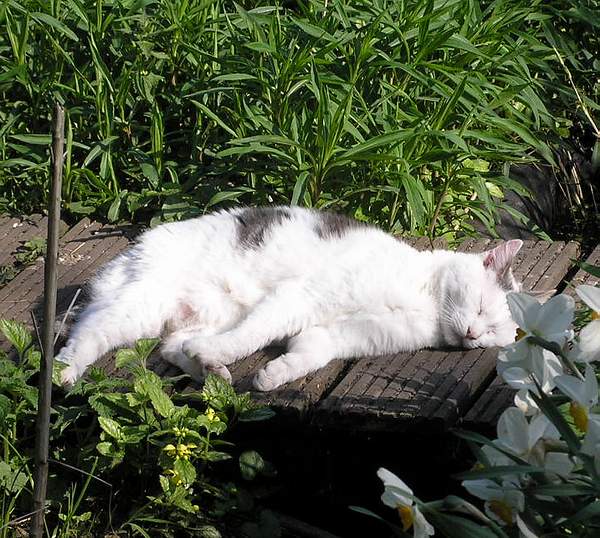 Dan opeens duikt het van de grijze bak af naar links de tuin in, in de bosjes.
