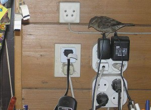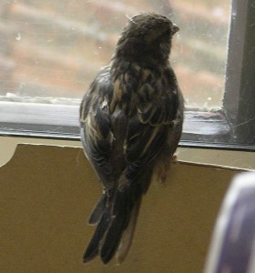 Een beetje in de huiskamer gevangen mus gaat spartelen en pikken.