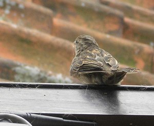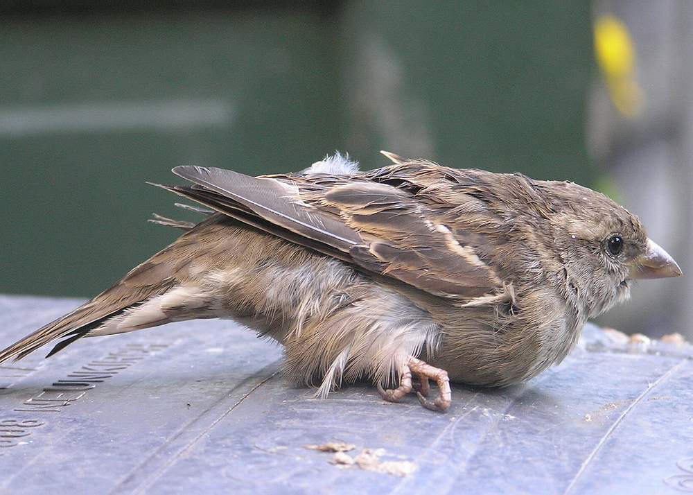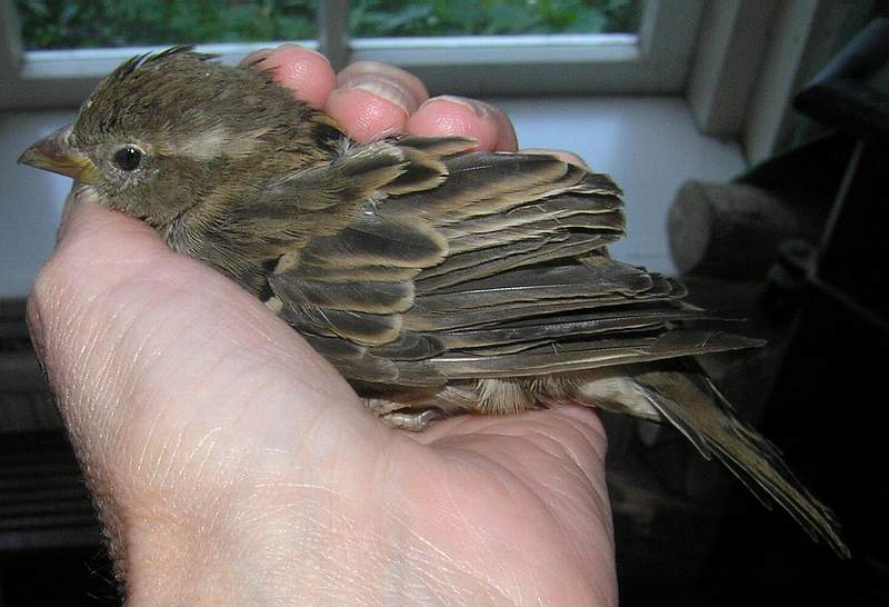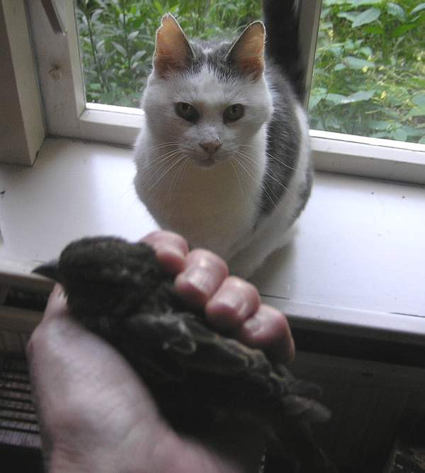 Ik bekijk het musje. Alles zit er nog aan. Geen grote wonden, geen lamme vleugels of pootjes.