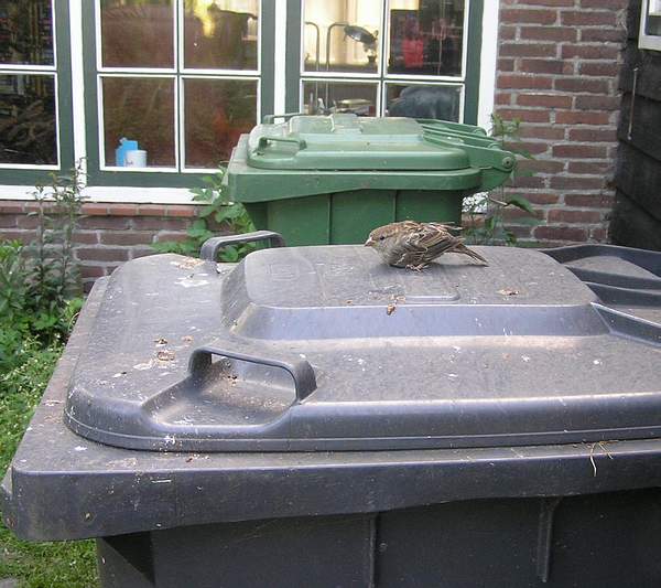 Ik zet het musje buiten op de grijze bak.