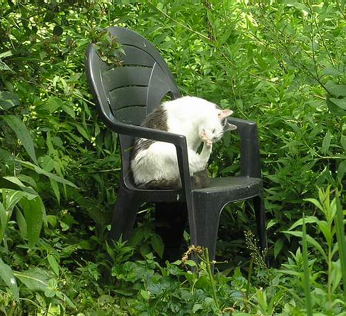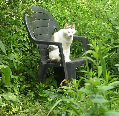Dan opeens duikt het van de grijze bak af naar links de tuin in, in de bosjes.