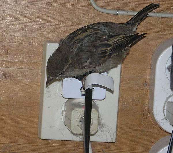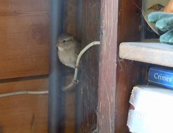 Een beetje in de huiskamer gevangen mus gaat spartelen en pikken.