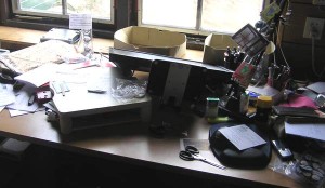 Dan merk ik dat die op het bureau hoort te staan er ergens onder ligt.