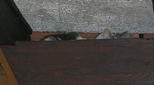 Guus heeft zich aan mijn vriendelijk geaai ontworsteld, heeft de afzuigkap beklommen en zit verstopt in een balk boven de keuken.