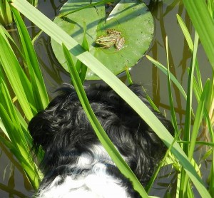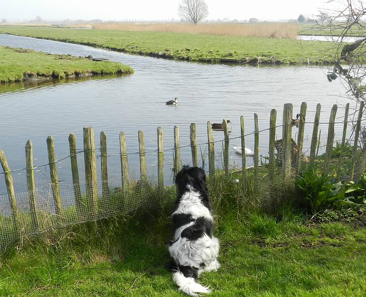 Ze rent linea recta naar de sloot en staat erin te loeren.