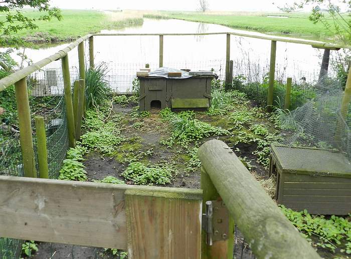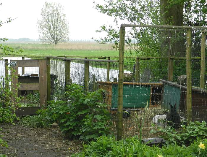 Zelfs achter het hekje zit een stuk gaas van 30-40 cm (om te voorkomen dat wanneer we het opendoen een konijn de kans schoon ziet en de benen neemt).