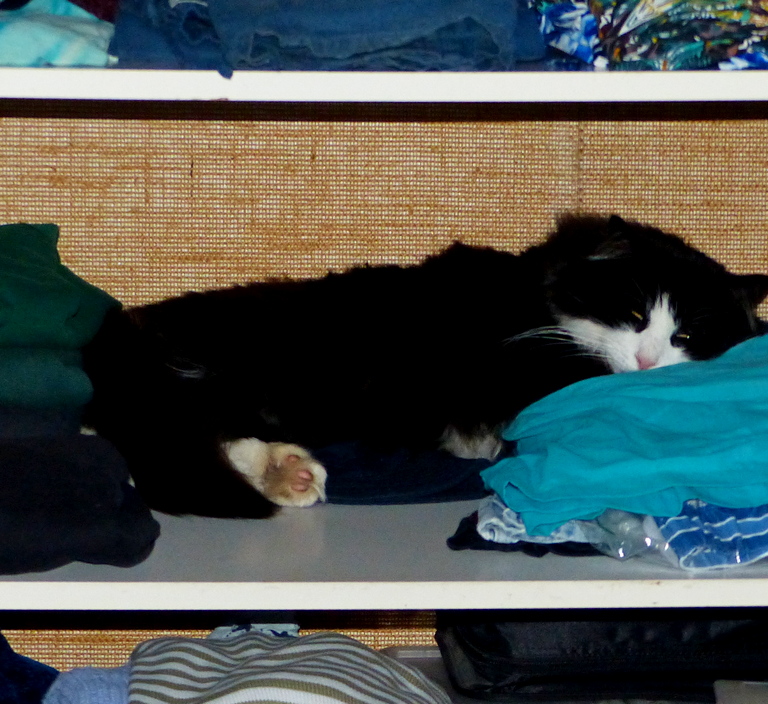 Loki op zijn favoriete plekje in mijn klerenkast.