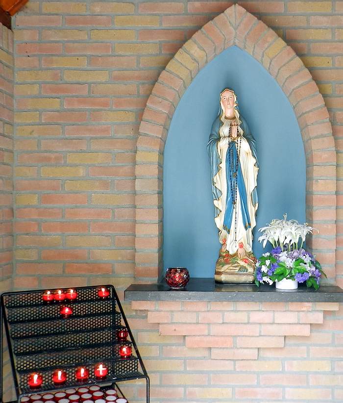 Mooie foto. Maria in een armzalig muurtje met een ikearekje voor haar minikaarsjes.
