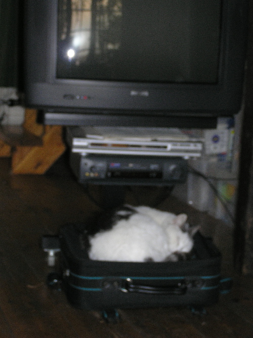 Agossie. Een soort vakantie thuis voor de poezebeesten dus. En koffers zijn om in te slapen, dat is algemeen bekend.