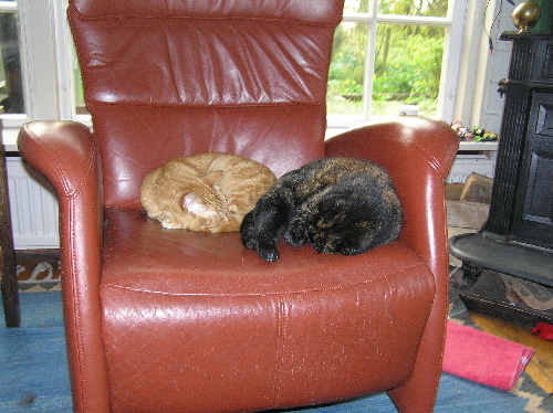 Het na-ontbijt slaapje, nodig want hij gaat wel erg laat naar bed, doen we zo: Guus slaapt op R’s koffer; Sammie kruipt bij Eeb op J’s stoel.