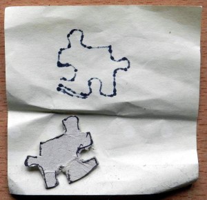 Maar dan, na anderhalf uur puzzelen, stuit ik op een namaak-puzzel-stukje dat vermoedelijk een ontbrekend stukje moet vervangen.
