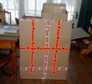 Woonkamer wat minder (die grote doos is helemaal vol kartonnen dozen die eerst in de schuur stonden en er komt morgen dus nog zo’n grote doos bij).