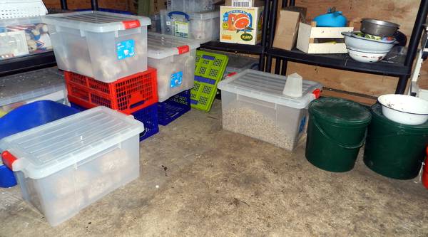 Gisteren al het graan voor de kippen en het brood voor de vogels in de boxen gedaan.