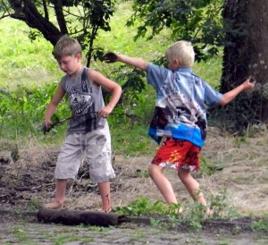 Ze kneden van de modder aan de overkant modderballen, werpen die naar auto’s en naar fietsers.