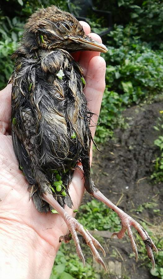 Ik vis het op en het *lijkt* alleen modder maar in die modder zit een jonge spreeuw.