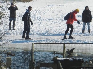 Ik denk: die gaat iets zeggen over de plaatselijke Tocht en dat ik de eenden moet wegjagen zodat het wak kan dichtvriezen.