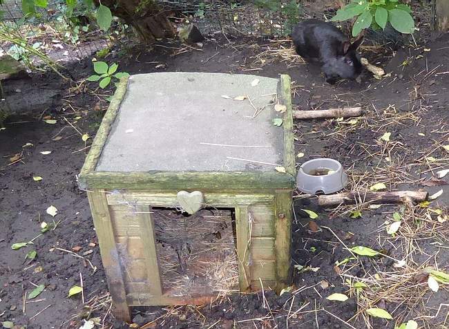 De konijnen zitten er al een tijd niet meer in (nog wel óp), zodat schoonmaken er niet meer van kwam.