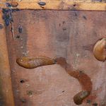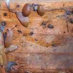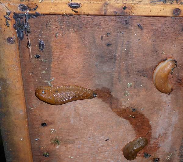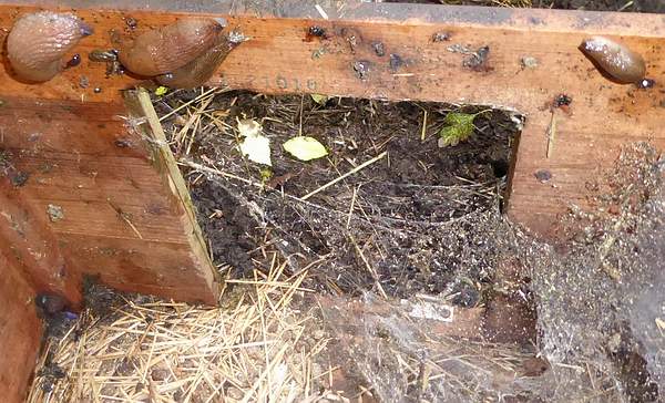 Want niet alleen hangen er flarden maar het huisje wordt intensief bewoond door slakken en pissebedden.