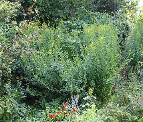 Links een foto van hoe dit deel tuin eruit zag begin augustus 2004. Spontaan, niet drastisch teruggeknipt.